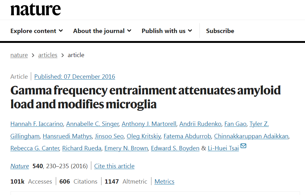 - Gamma frequency entrainment attenuates amyloid load and modifies microglia, Nature, 07 Dec 2016